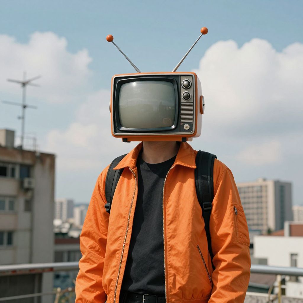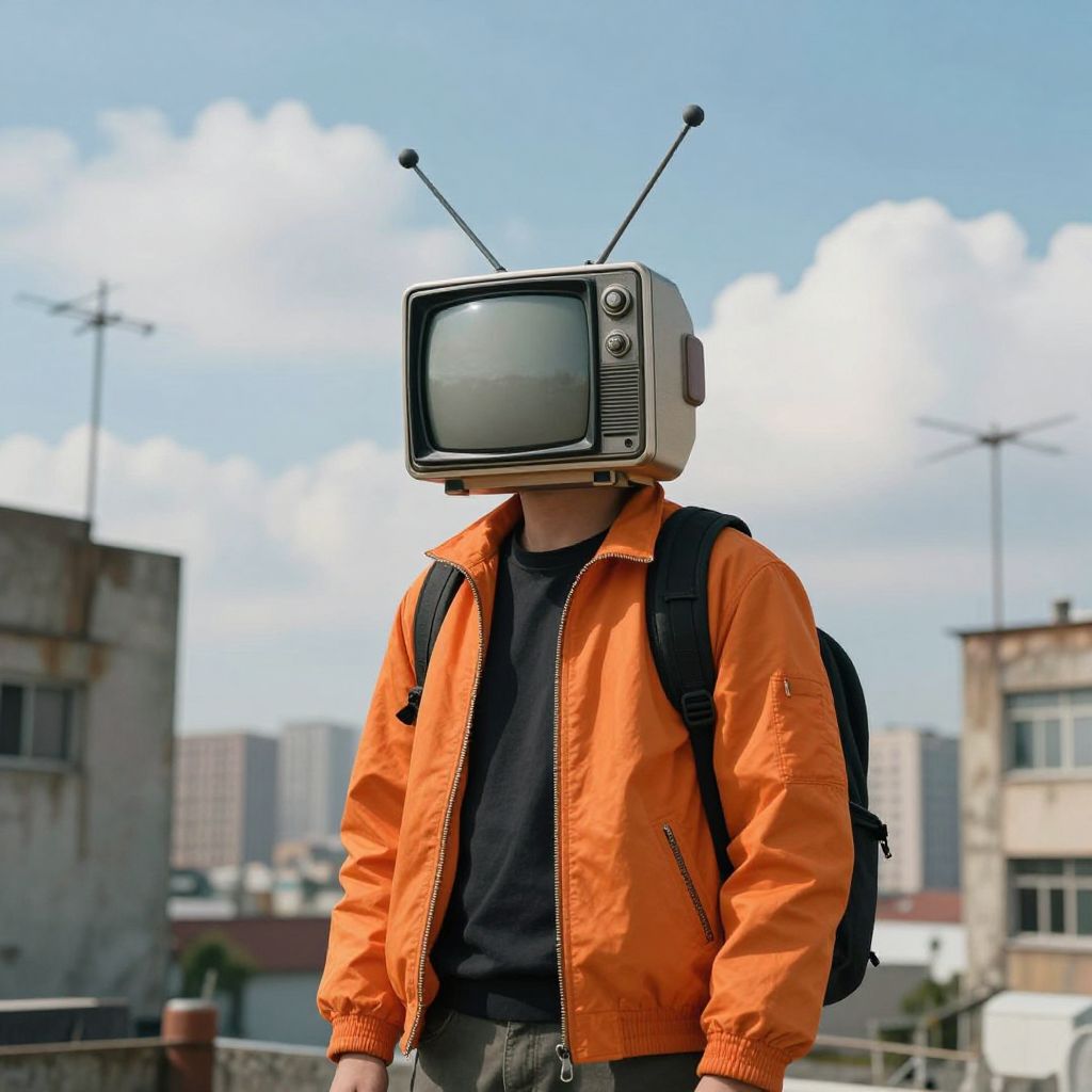 Photograph of a person with an old-fashioned, black-and-white CRT television for a head, featuring two orange, antenna-like rods on top. They wear a bright orange, slightly worn, jacket over a black shirt, with a black backpack. The background shows an urban rooftop with a clear blue sky and scattered white clouds. Buildings of varying sizes and styles are visible in the distance. The image has a vibrant, quirky, and surreal aesthetic, blending urban and retro elements. The person's hands are not visible, and their face is completely obscured by the television.