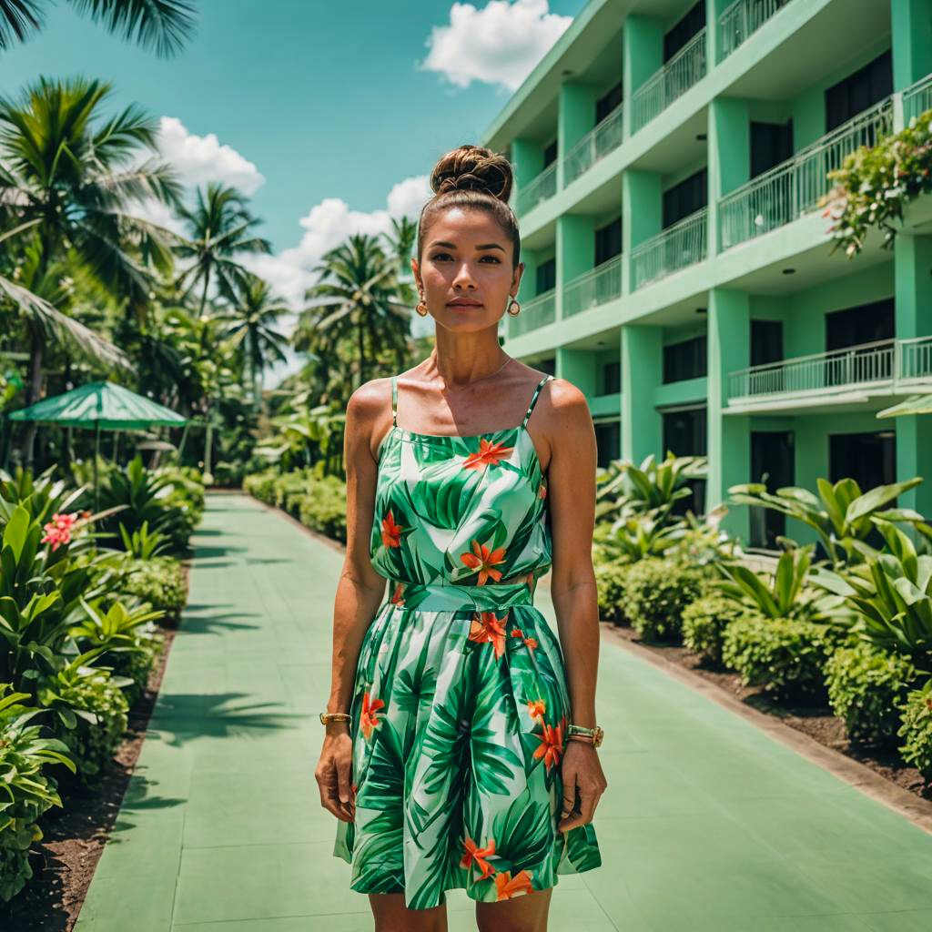 Woman in Tropical Print Summer Dress Outdoors