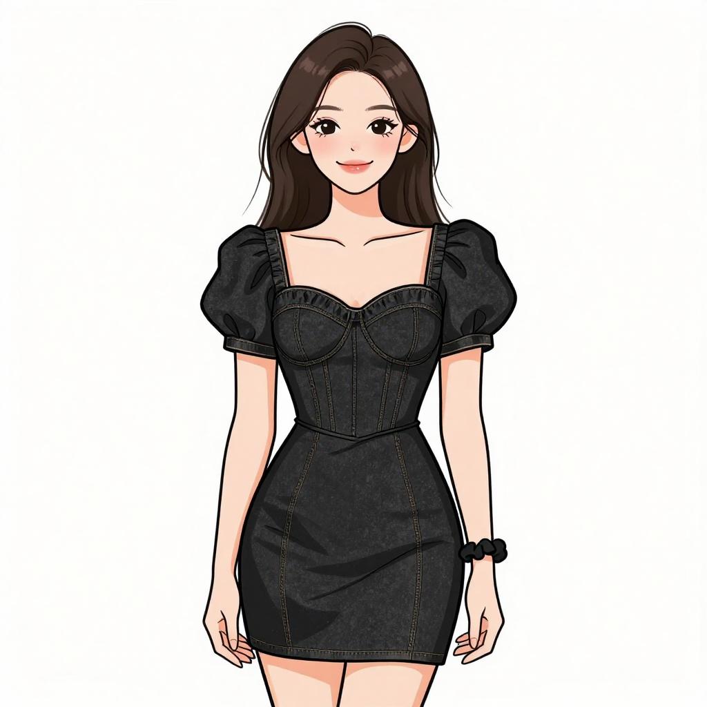Woman with pretty face and pretty hair. smiling Woman, modern romantic, black denim mini dress, sweetheart neckline, puff sleeves, short sleeve length, fitted bodice with seaming details, thigh-length skirt, black scrunchie, subtle makeup, white studio background. --sref 1467