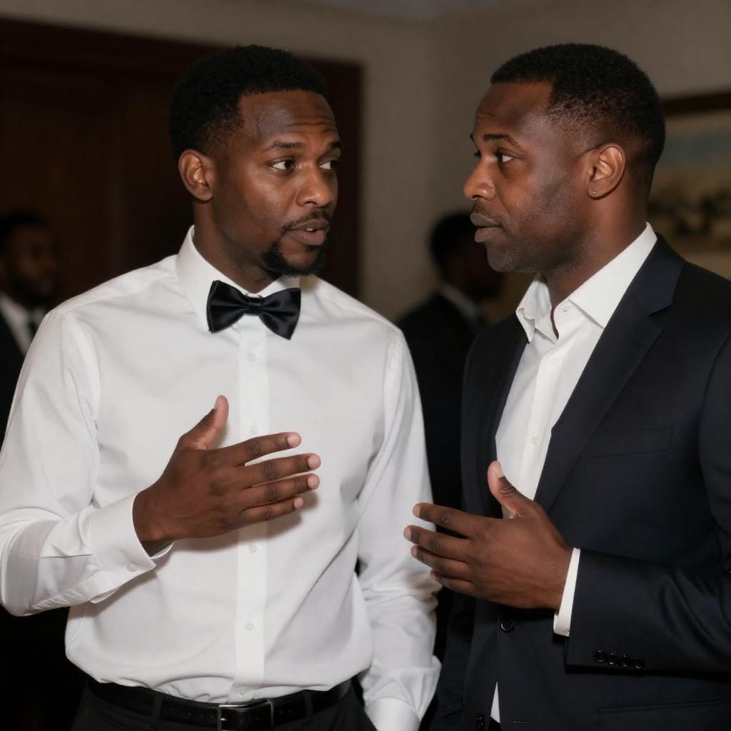 Photograph of two Black men in a dimly lit room. The man on the left wears a white dress shirt and black bow tie, gesturing with his right hand. The man on the right, in a dark suit and white shirt, looks intently at the other man, with his left hand raised. Both have dark skin and short hair.