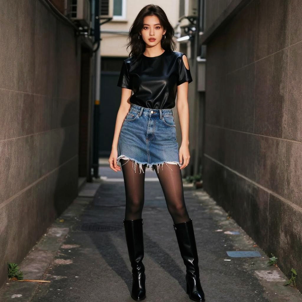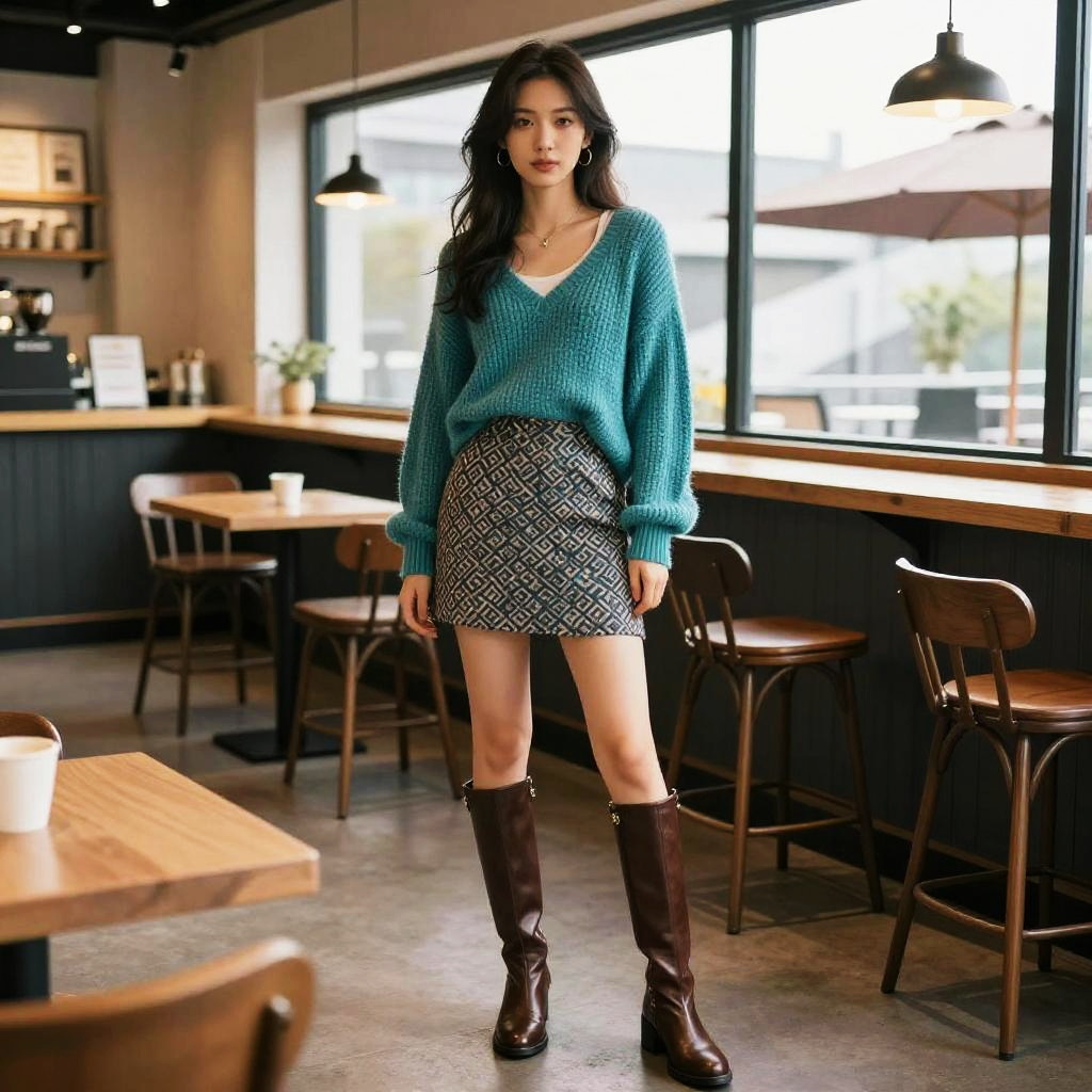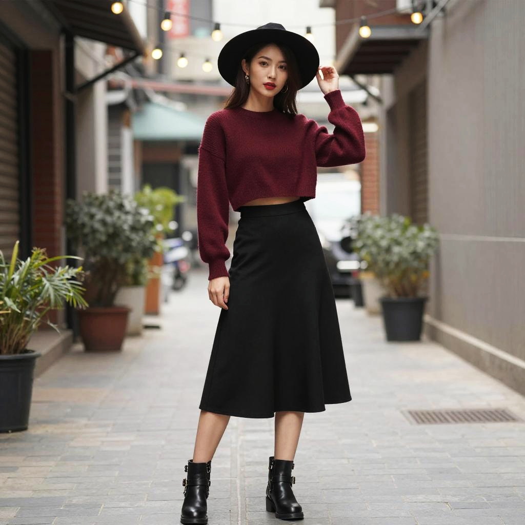 A stocky woman in a preppy chic style, wearing a burgundy cable knit sweater, black pleated mini skirt, and brown leather ankle boots, stands in a refined tea service setting in a secluded courtyard, surrounded by lush greenery and elegant decor. Long straight hair cascades down her shoulders, complemented by a brown leather satchel bag. Sexy. Pretty face and beutiful eyes