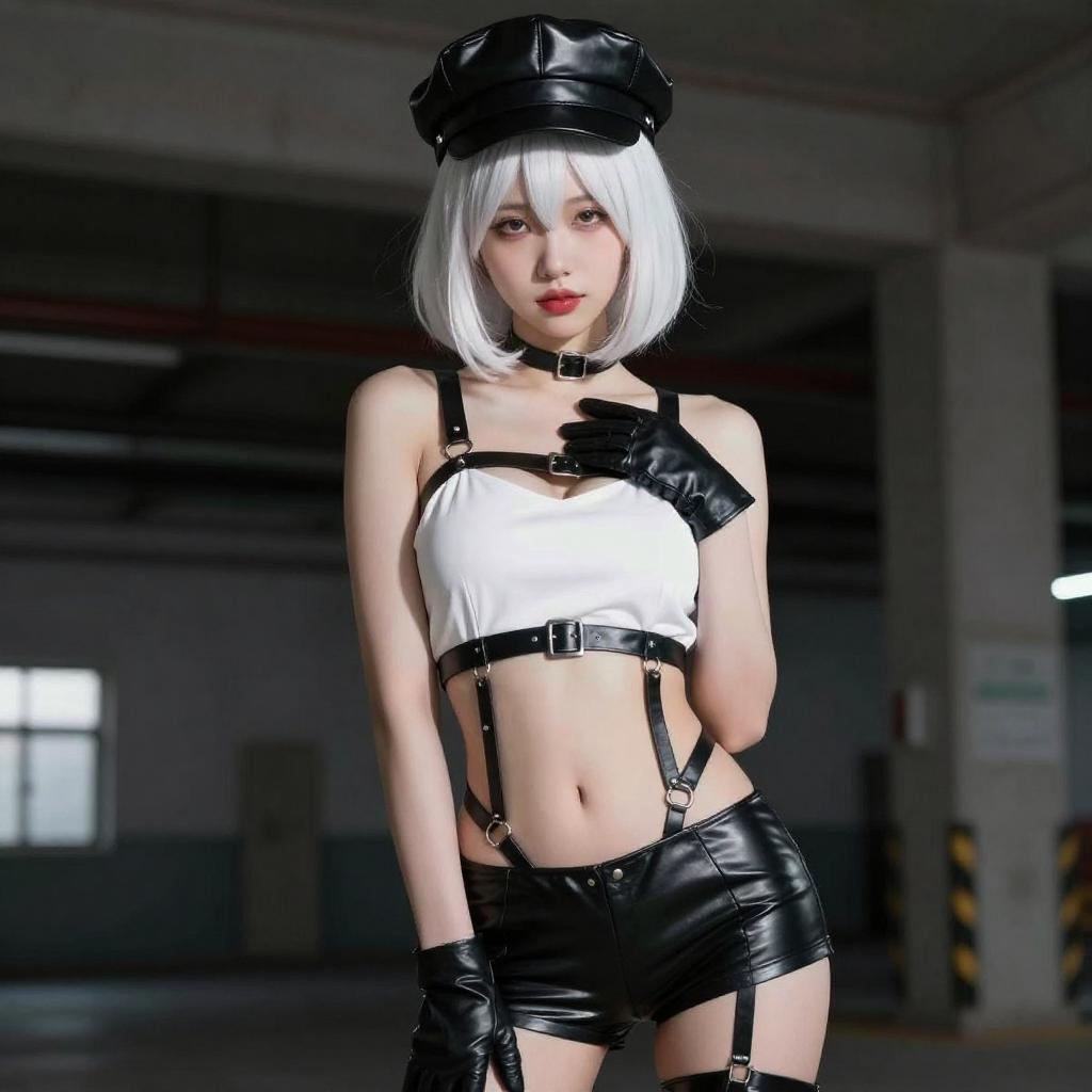 Photograph of a woman with white hair, wearing a black leather hat, black leather harness, and high-waisted black latex panties. She has black gloves and her arms are raised above her head. Her mouth is open, tongue slightly out. The background includes a white wall and red ceiling. The perspective is low-angle, emphasizing her legs and outfit.