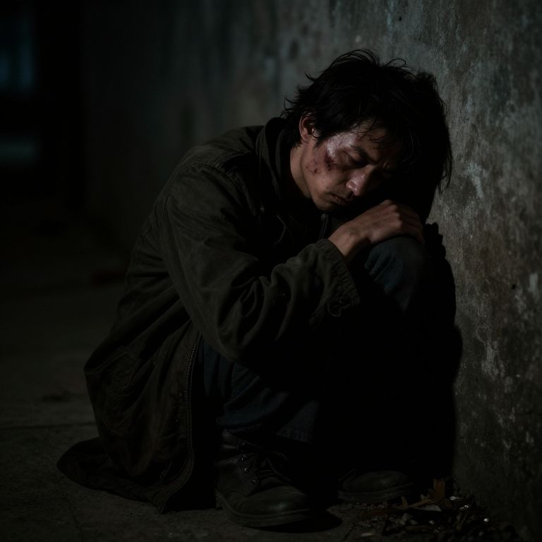 Photograph of a disheveled, bruised man with dark hair, wearing a black jacket, huddled and crying against a grimy, dark