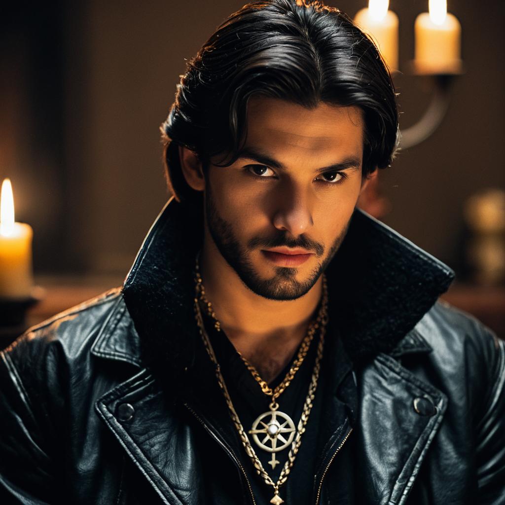 Portrait of a young man with brown and black short hair wearing a black leather jacket, two gold necklaces, and gold earrings. The background is blurred, emphasizing his focused expression with a closed mouth, looking directly at the viewer.