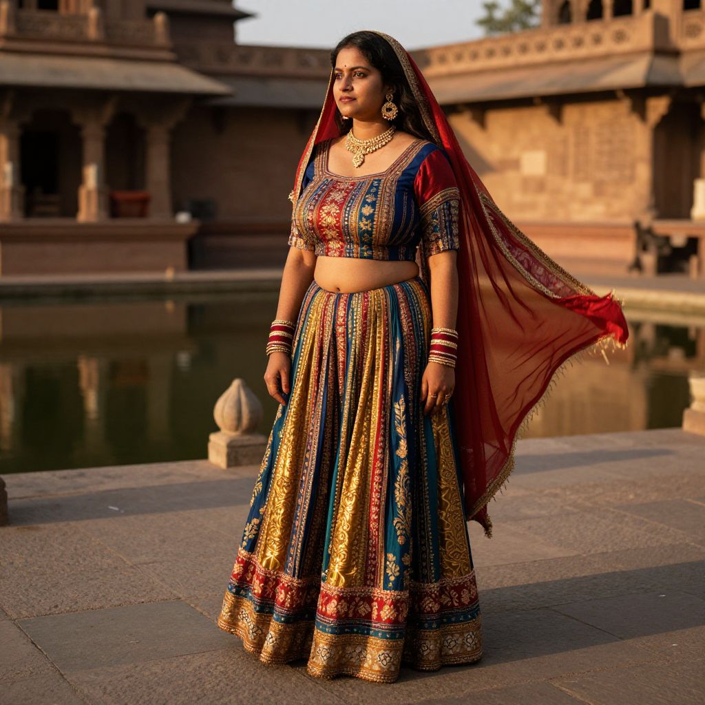 Photograph of a South Asian woman standing outdoors in traditional attire. She wears an ornate blue and gold embroidered crop top and a full-length skirt, both adorned with intricate patterns. She also dons a red and gold veil draped over her head and shoulders, and multiple gold bangles on her wrists. She has dark hair, adorned with a small headpiece, and is wearing heavy makeup. The background features a traditional stone building with a reflective water body, capturing the warm, golden light of sunset. The image emphasizes her elegant, traditional style against the historical architectural backdrop.