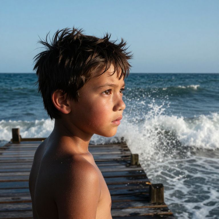 Craft an image of a weathered boy with sun-kissed skin and hair tousled by sea spray, gazing out to sea from a rustic wooden pier. His intense eyes, framed by a double exposure of crashing waves against the dock, capture both his resolute spirit and the boundless horizon before him. Employ a muted palette of deep blues and tans to balance the contrast between his tangible presence and the ethereal dance of light on water, reflecting life's transient journey.