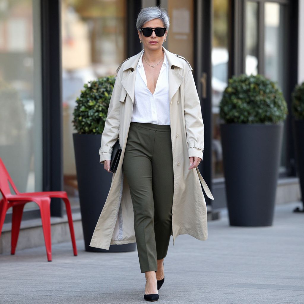 Photograph of a stylish woman with short, silver-gray hair walking confidently on a city street. She's wearing a white, low-cut blouse, olive green pants, and a long, beige trench coat. She holds a black clutch in her left hand. The background includes a storefront with glass windows, red chairs, and black, cylindrical planters with topiary. The setting has a modern urban vibe.