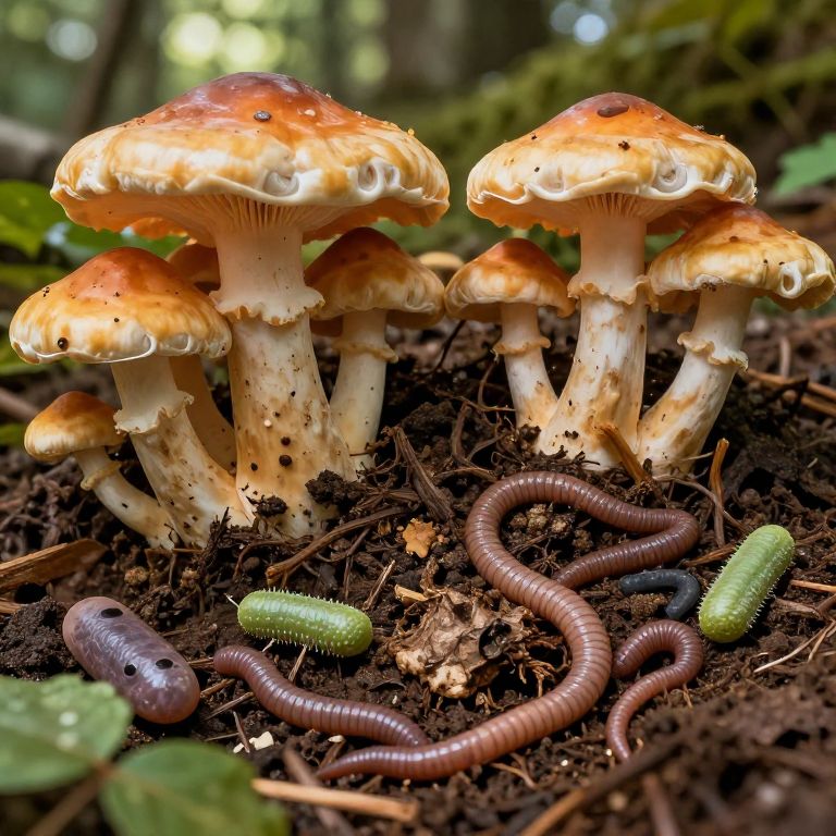 Decomposers in a forest ecosystem, detailed close-up of fungi, bacteria, and earthworms breaking down organic matter, rich soil textures, dappled sunlight filtering through leaves, vibrant natural colors, highly detailed, scientific illustration style