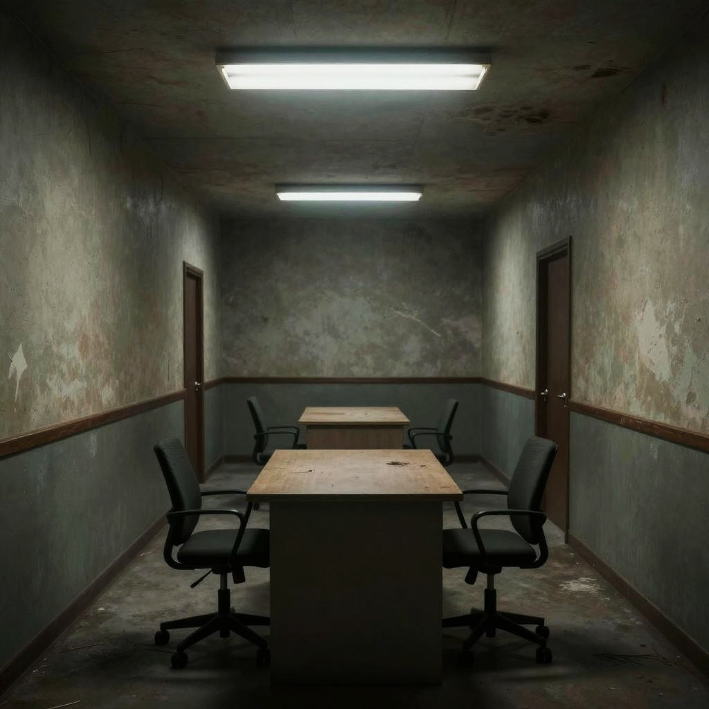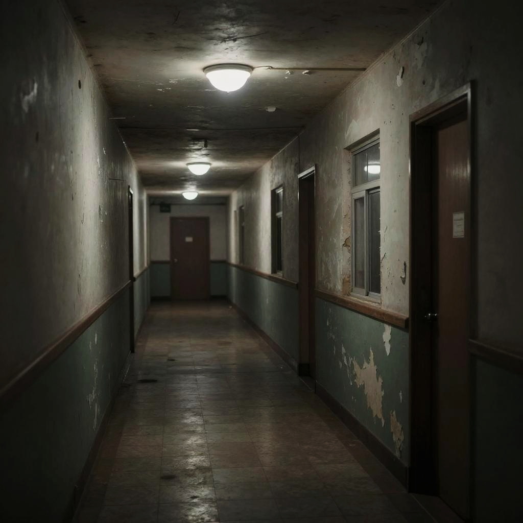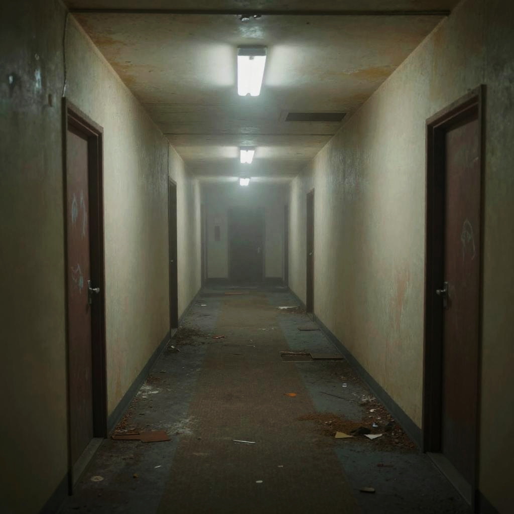 Creepy liminal spaces at dusk, abandoned hallways with flickering lights, unsettling shadows, eerie fog creeping through empty doorways, hyper-realistic, cinematic lighting