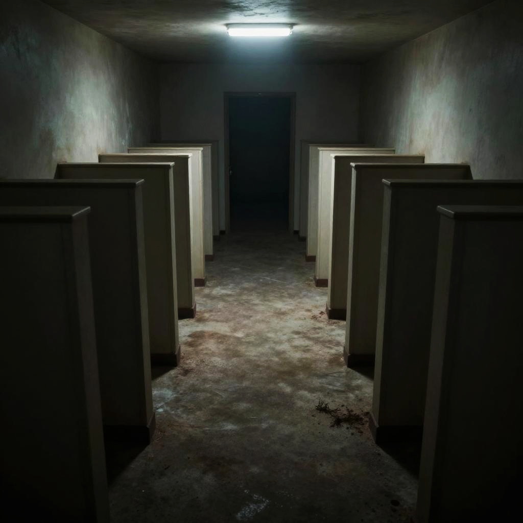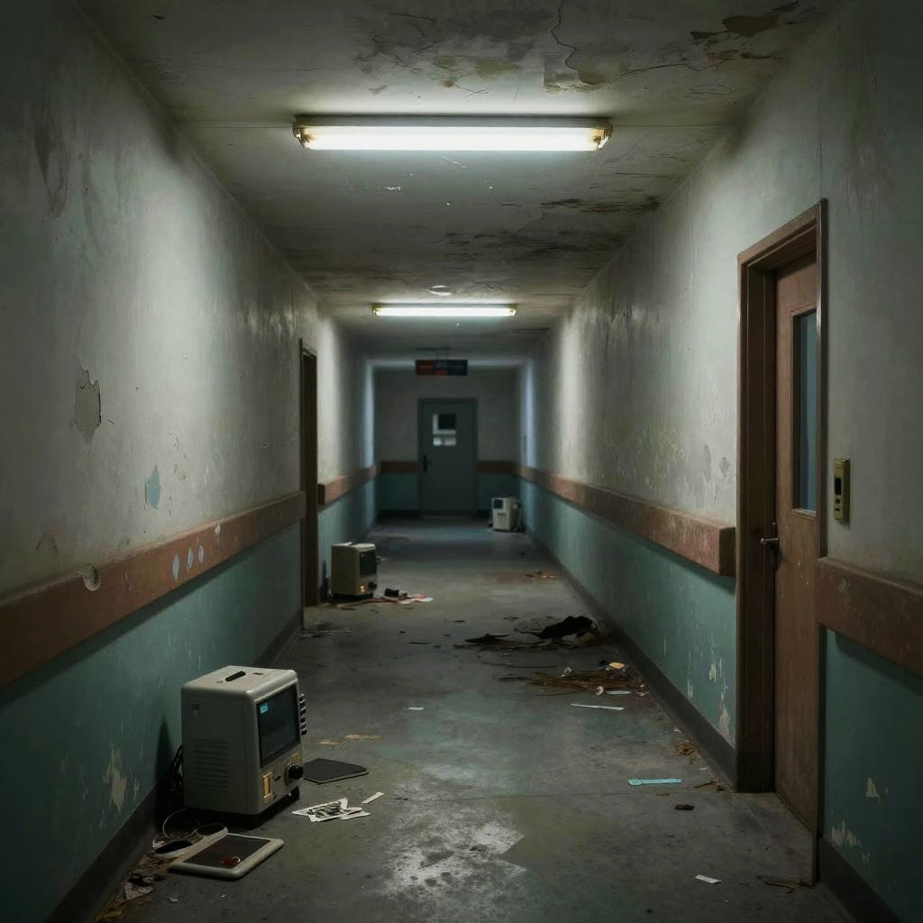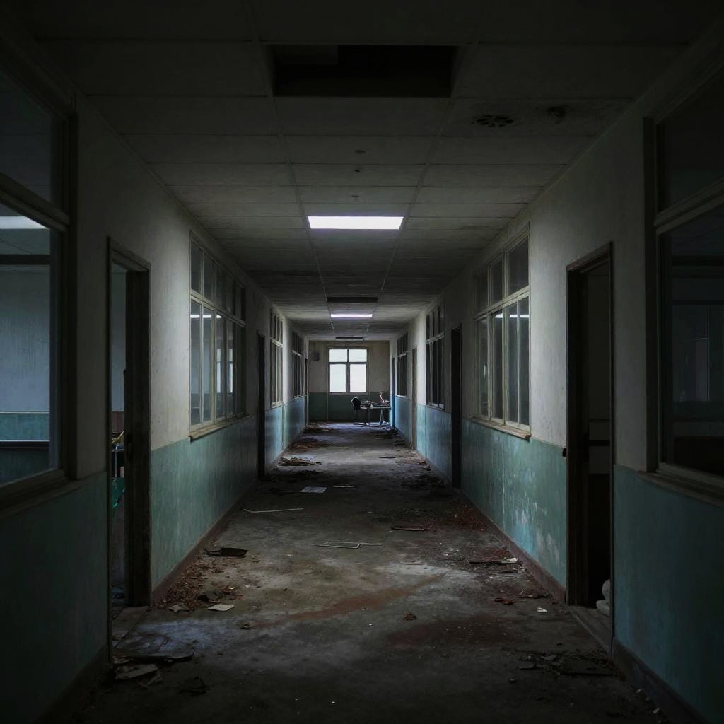 Creepy liminal spaces at dusk, abandoned hallways with flickering lights, unsettling shadows, eerie fog creeping through empty doorways, hyper-realistic, cinematic lighting