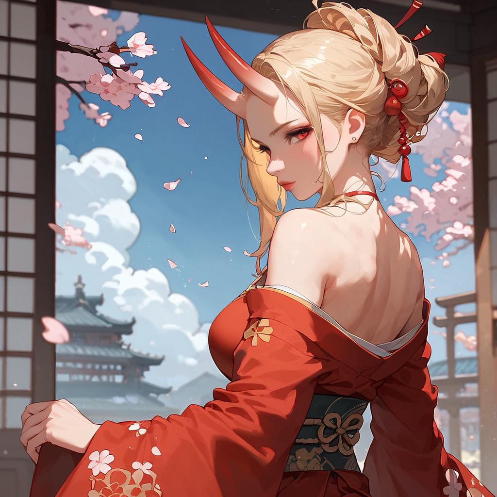 Blonde Oni Woman in Red Kimono