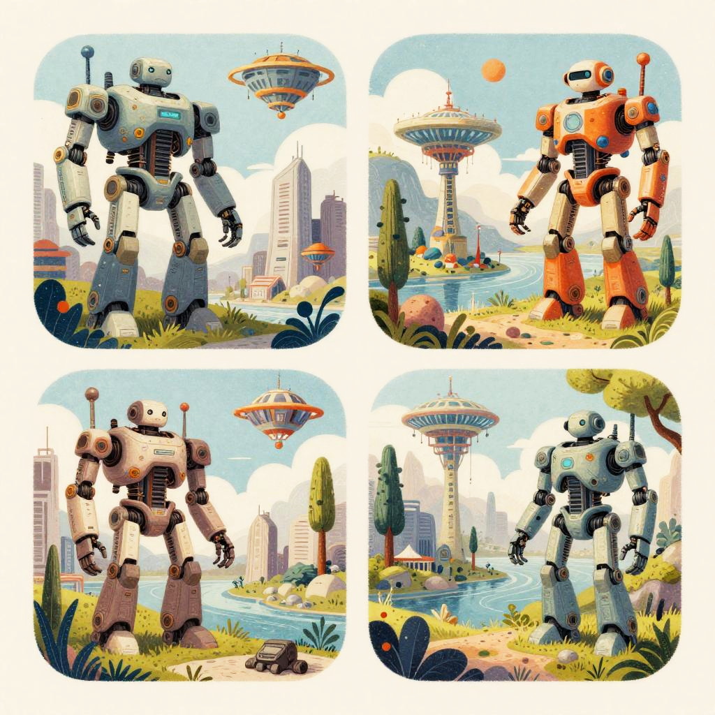 Colorful Retro Futuristic Robots in Sci-Fi Landscapes
