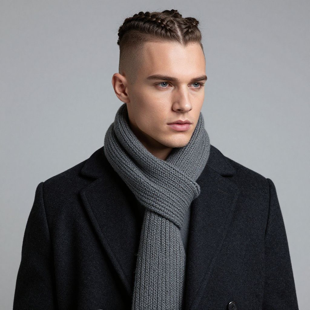 Portrait of a young Caucasian man with a defined jawline and smooth skin, styled with a Viking undercut and braided hair. He is wearing a dark wool overcoat layered with a thick, knitted grey scarf, captured in a professional studio with soft diffused lighting and a neutral background. The image showcases a modern fashion look with detailed textures in clothing and hairstyle.