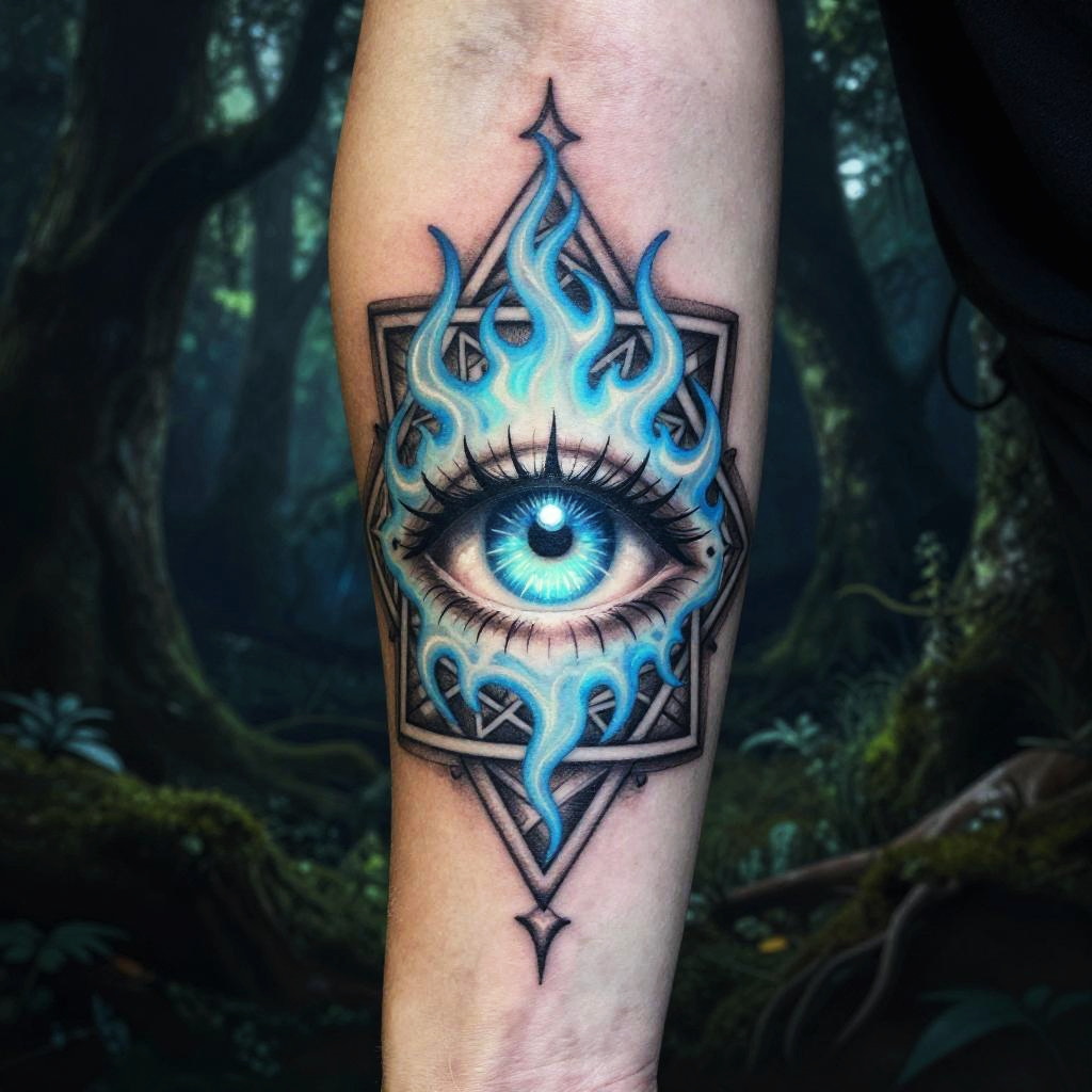 Mystical eye tattoo glowing with ethereal blue flames, intricate geometric patterns surrounding it, detailed shading on a forearm, dark mystical forest background