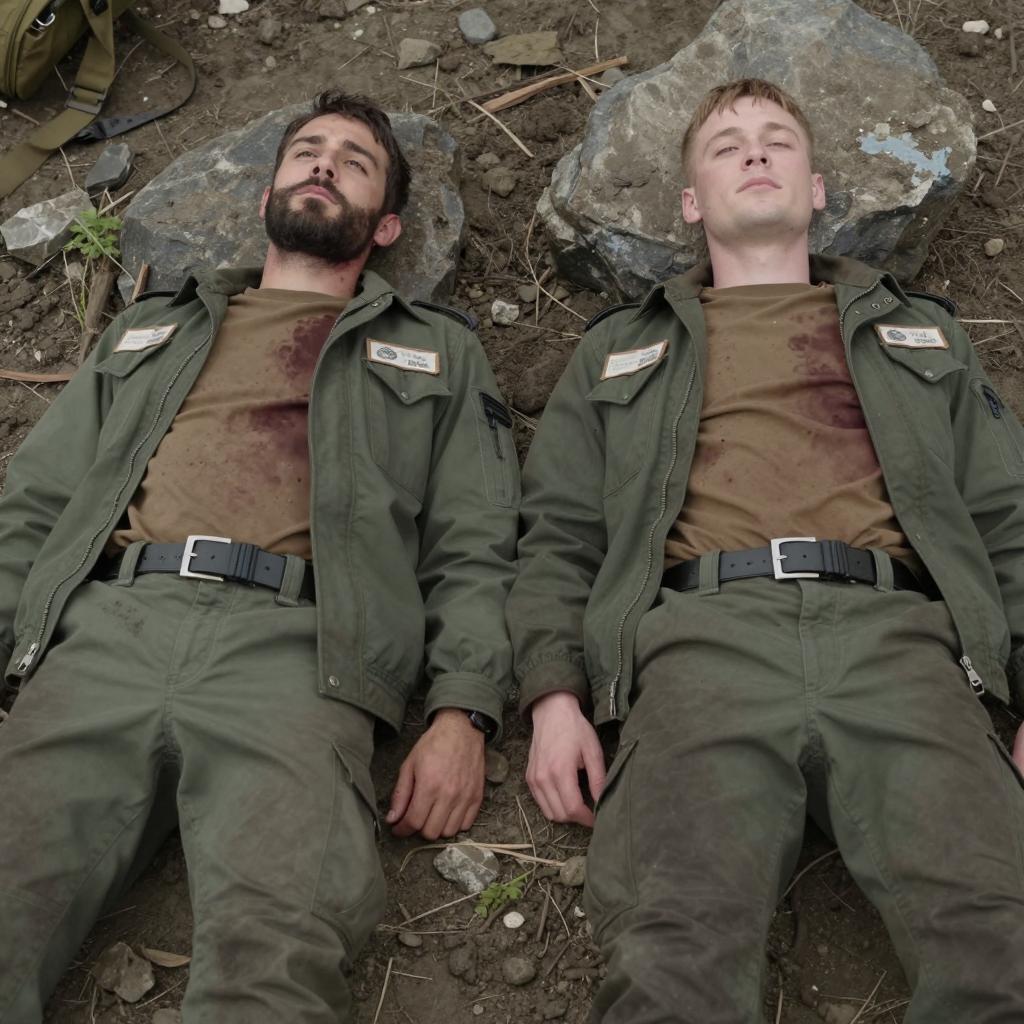 Two men lie on a rocky, muddy ground, side by side, with green military-style jackets and bloodstained brown shirts. Both have name tags on their chests. The man on the left has a beard, the man on the right is clean-shaven. Their hands are relaxed by their sides, and they are both facing upwards. The background includes rocks and dirt.