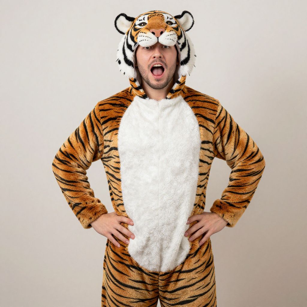 Photograph of a surprised man in a tiger onesie with white belly and headpiece, hands on hips, against plain white background.