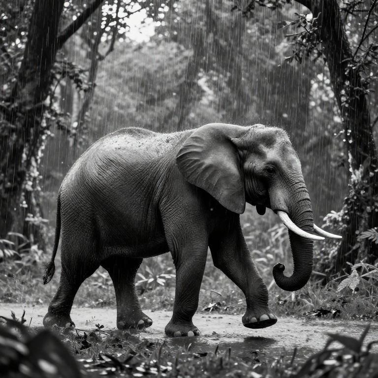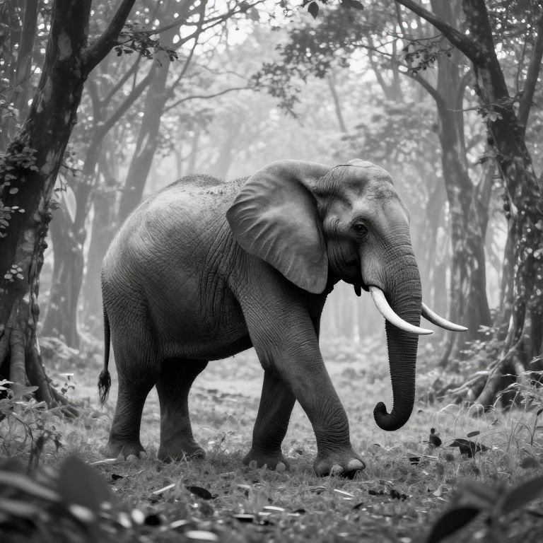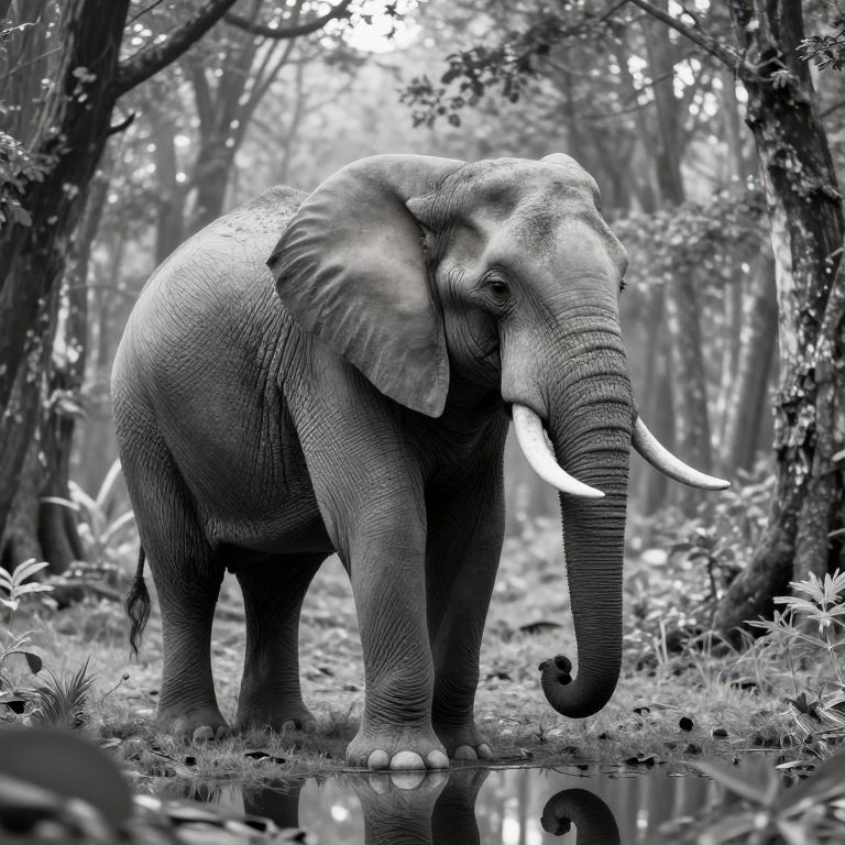 Elephant strides gracefully through a misty forest pathway, its reflection mirrored perfectly in the calm waters below, surrounded by dense foliage and towering trees.