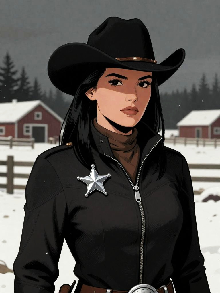 Quiet ranch heiress with string of wooden prayer beads, black hair, Christmas farm, clear sky with faint falling snow, detailed, dark colors, dramatic, graphic novel illustration, 2d shaded retro comic book