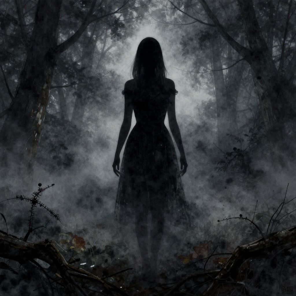 A digital illustration depicts a dark, silhouetted figure of a woman with long hair standing in a misty, dense forest. She wears an off-the-shoulder, long-sleeved dress. The background is shrouded in thick, grey-blue fog, with tall, dark trees framing the scene. The light source behind her creates a glowing, halo-like effect around her head, enhancing the eerie, mysterious atmosphere. Sparse, twisted branches and leaves are visible at the bottom and sides, adding to the haunting, otherworldly feel of the image.