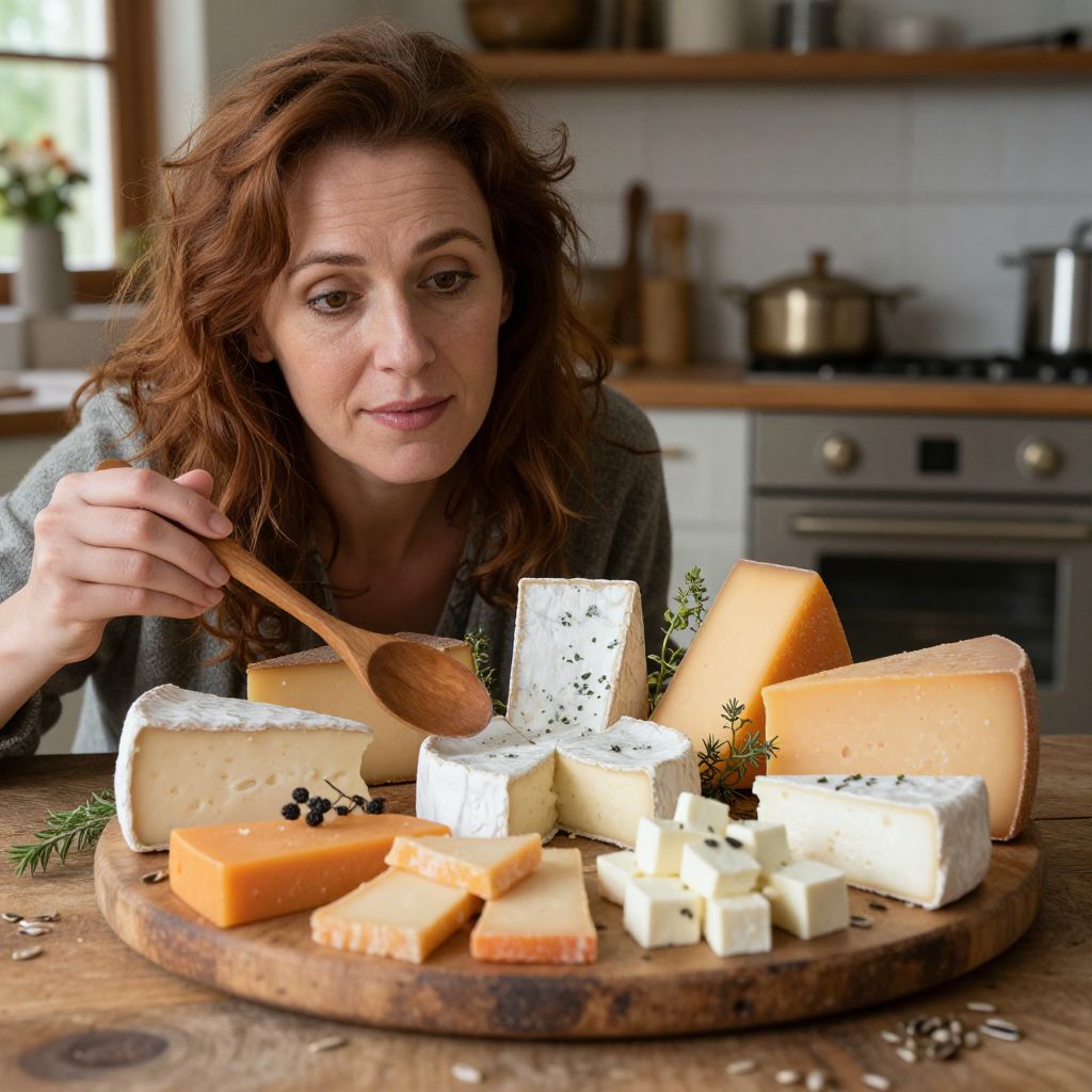 A beautifully arranged cheese platter on a rustic wooden table in a cozy farmhouse kitchen, featuring a variety of cheeses such as brie, cheddar, gouda, and feta, with fresh herb sprigs and sunflower seeds scattered around. A slightly weary but kind-faced woman in her 40s with warm brown eyes and wavy auburn hair watches the platter with a smile, holding a wooden spoon as if about to serve it.