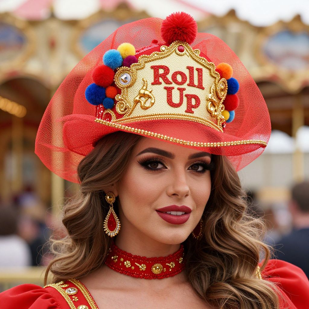 Woman wearing a vibrant red and gold \"Roll Up\" Circus Carousel Wired Veil Hat adorned with colorful pom-poms and intricate golden embellishments, complemented by a matching red outfit and styled hair.