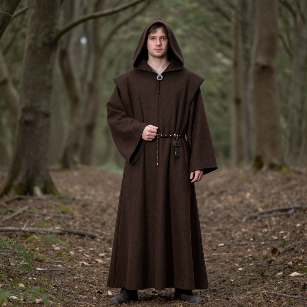 Medieval monks robe, man in a brown robe and hood standing in a forest