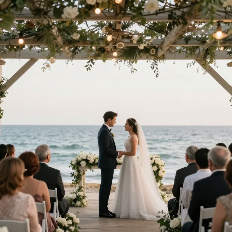 Photograph of an outdoor beach wedding. A bride in a white lace strapless gown and veil stands facing a groom in a navy suit. They stand at a wooden aisle adorned with white flowers and greenery, under a pergola with string lights and more greenery. Guests in formal attire sit in white chairs on either side. The background shows a calm ocean and a bright sky. The couple gazes into each other's eyes, holding hands. The image has a soft, romantic lighting.