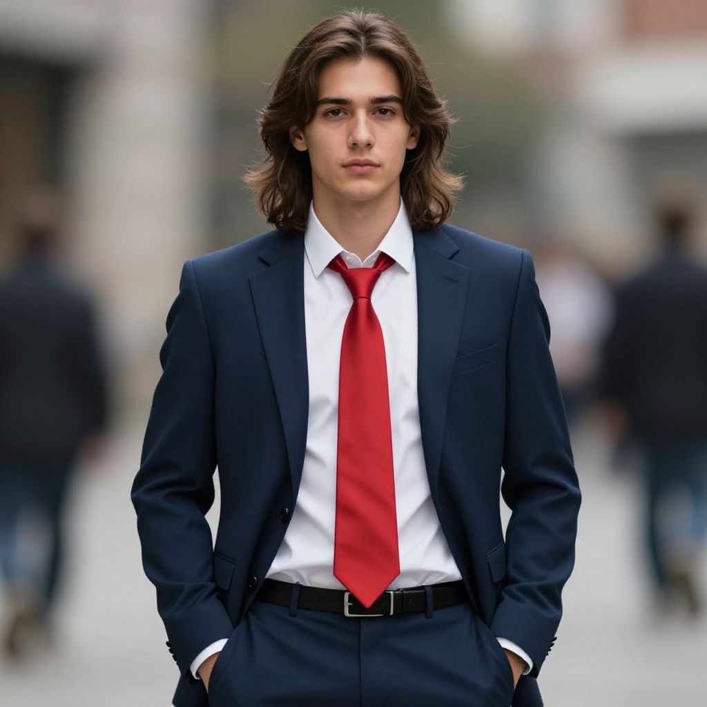 "semi formal attire big, necktie, solo, 1boy, red necktie, male focus, suit, hands in pockets, formal, long hair, realistic, shirt, brown hair, belt, white shirt, collared shirt, looking at viewer, jacket, pants, blurry background Realistic photo of casual sexy person with pretty face"