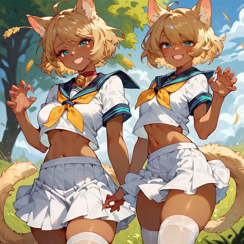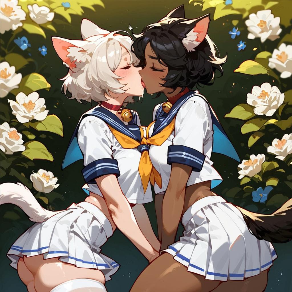 (score_9, score_8_up, score_7_up, score_6_up, score_5_up, score_4_up), petite, 2 short cat girl, brown_skin, shiny_skin, blush, white short hair, Green eyes, thick thighs, white short sleeves serafuku, (((white skirt))), white thighhighs, midriff, hair_bell, yellow _neckerchief, flowers background, looking_at_viewer, standing, depth of field, expressive_clothes, Red choker, pastel_color, french_kiss, closed eyes, facing_another, eye_contact, grabbing_another's_ass, yuri