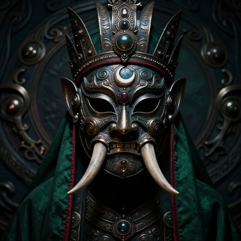 An intricate and imposing mask covering the entire face, crafted with ornate metallic details and embellished with swirling patterns, crescent moon motifs, and gemstone accents, The mask features two prominent tusk-like protrusions curving outward, giving it an intimidating and ceremonial presence, A deep red trim runs subtly along the edges, adding a regal touch to the dark and mysterious aesthetic, The headpiece is crowned with layered metallic segments, each etched with fine engravings, and a central orb resting above the forehead, The figure is cloaked in shadowy, rich green fabric that drapes around the shoulders, blending seamlessly with a dark, textured background filled with abstract, metallic, and ornamental elements, The lighting casts a dim, moody glow, emphasizing the mask’s intricate craftsmanship and the enigmatic aura of the figure