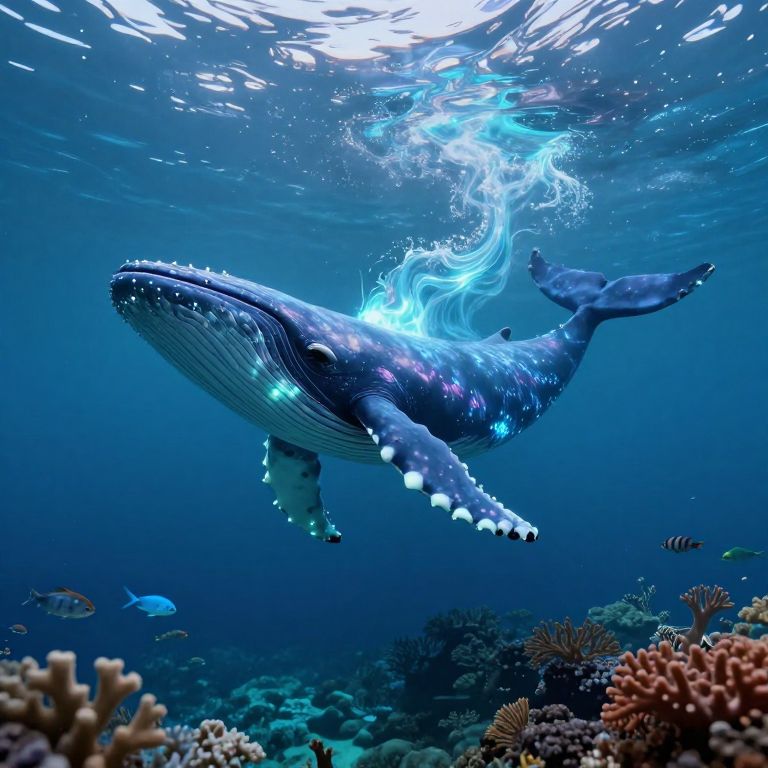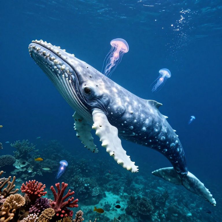 A dreamlike underwater scene depicting an ethereal landscape, featuring a majestic whale skeleton emerging from the depths, adorned with glowing jellyfish that illuminate its skeletal form. Captured from a bird's-eye view perspective, this surreal composition showcases a harmonious coexistence of vibrant coral formations and exotic sea creatures on the sea floor, creating an atmosphere of enchantment and tranquility as they contrast against the stark white bones of the whale skeleton.
