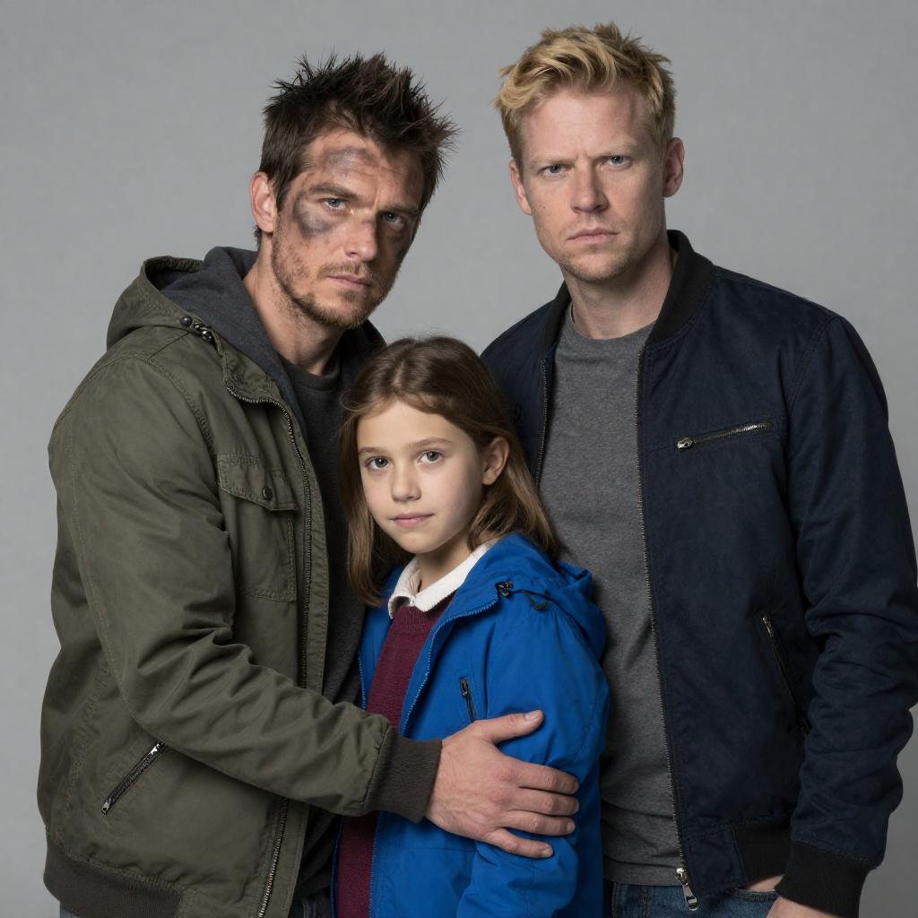 Photograph of three people. A father with dirty face, brown spiky hair, and green jacket on the left, a blonde-haired father with stern expression in the center, and a young girl with brown hair and blue coat in the middle. Father on left hugs girl, central father has arm around both. Grey background.