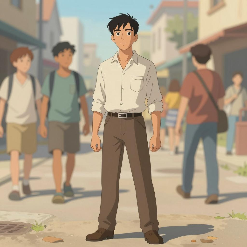 Caricature of an old man with green skin, black hat, red scarf, and black coat in the foreground. Background: two people, one carrying a brown bag, wearing blue and white clothes, standing in front of a red building with yellow windows and a street lamp.