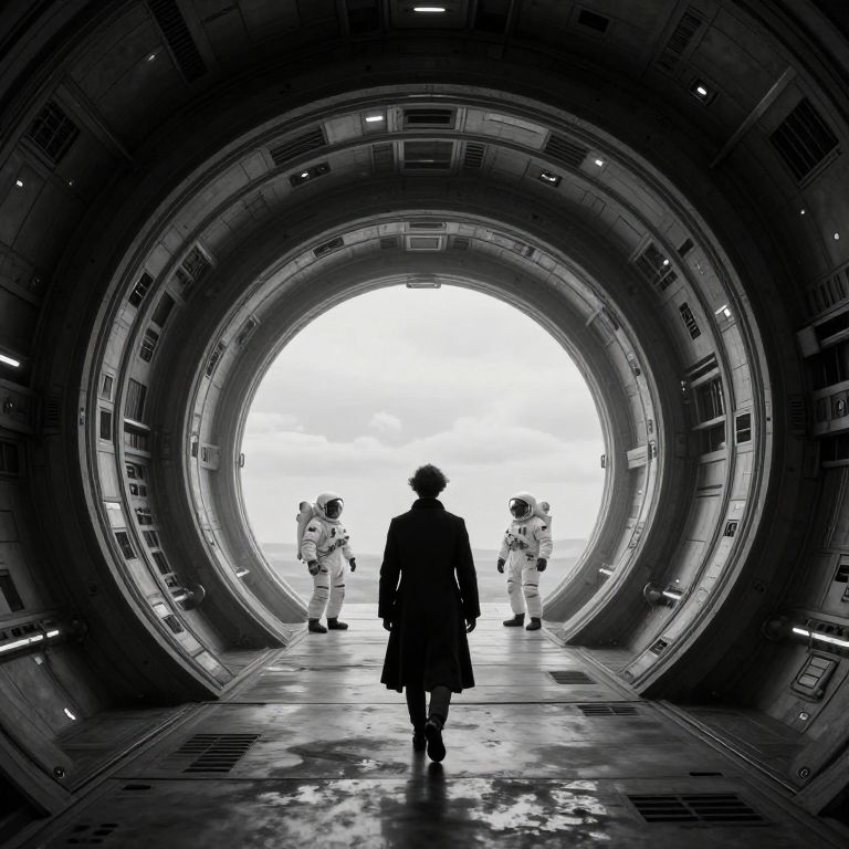 This black-and-white digital illustration depicts a person in a long coat walking towards a bright circular opening in a futuristic, metallic tunnel. The figure is silhouetted against the light, revealing no facial details. Surrounding the tunnel, the walls are adorned with various panels and lights. Outside the tunnel, three astronauts in white suits stand in a row, looking towards the entrance. The sky outside is bright with scattered clouds, contrasting sharply with the dark interior. The image has a sci-fi aesthetic, with smooth textures and a high-contrast color palette emphasizing the dramatic transition from darkness to light.