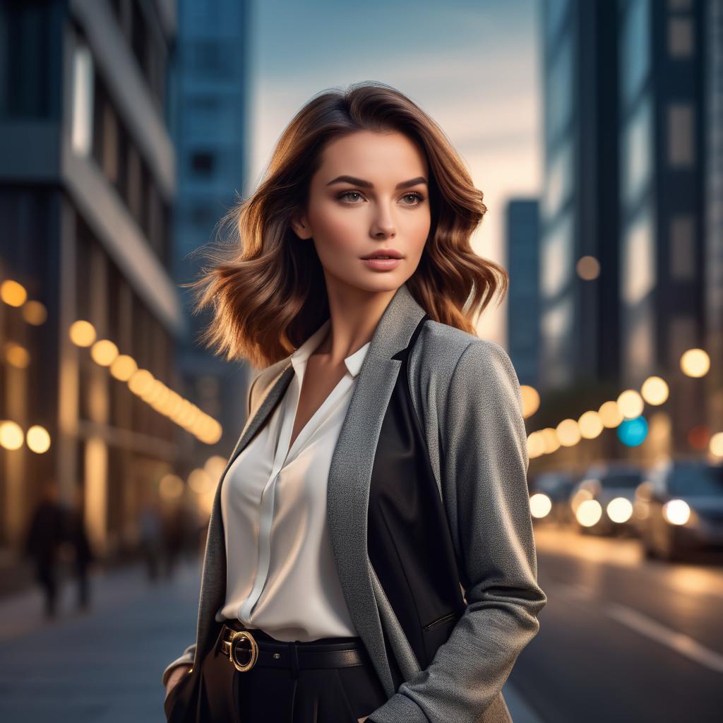 A striking young Caucasian woman with wavy shoulder-length brown hair stands confidently in a chic casual outfit featuring a white blouse and a grey blazer with black leather accents. The urban background is softly blurred with warm city lights and tall buildings during twilight, creating a sophisticated atmosphere.