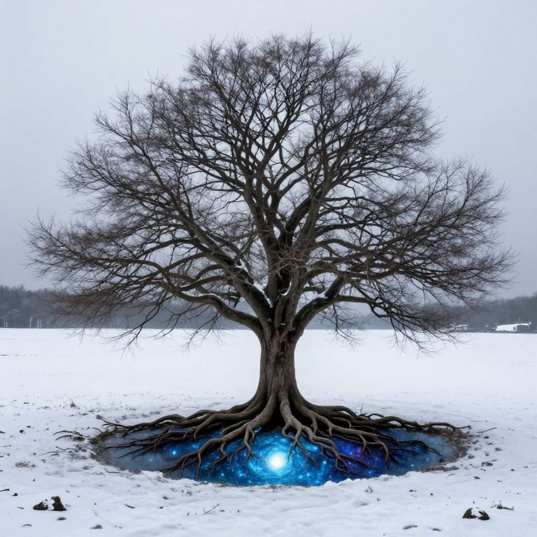 In a realm where winter whispers of solitude, a tree stands as a guardian of paradox, its roots embracing a luminous pool that mirrors the cosmos, while its branches cradle the weight of silence and the promise of renewal.