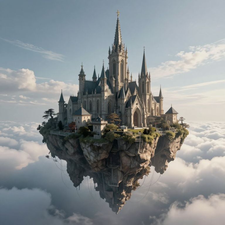Photorealistic digital artwork of a majestic, gothic-style floating castle perched on a rocky island surrounded by fluffy, white clouds. The castle has multiple pointed spires, intricate stone carvings, and a grand central tower with a cross at the top. Reflection of the castle can be seen in a calm, mirrored surface below. The sky is bright blue with scattered clouds, enhancing the ethereal, magical atmosphere. Greenery and small trees dot the rocky island, adding a touch of nature to the fantasy scene.