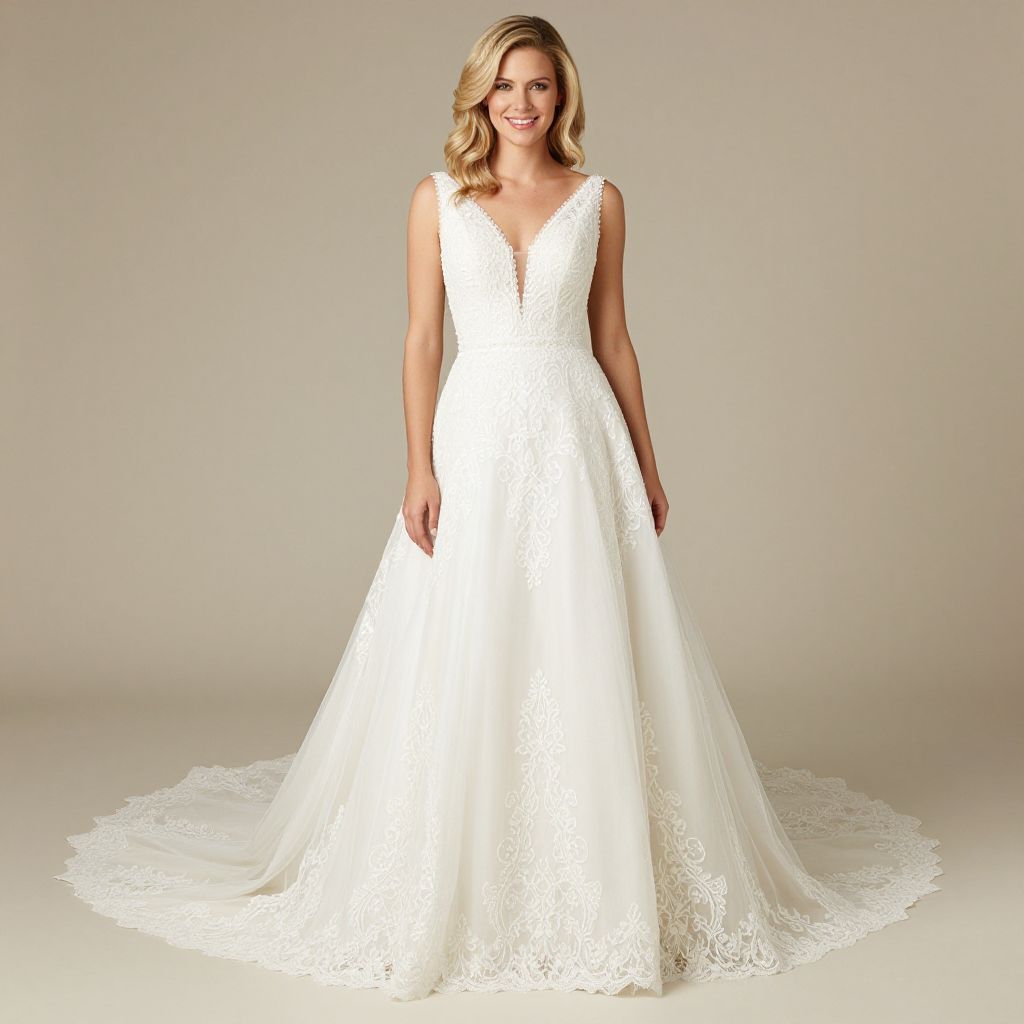 Photograph of a smiling blonde woman with wavy hair, wearing a sleeveless, white lace wedding dress with a deep V-neck and a full, flowing skirt that extends into a slight train. The lace detailing is intricate, adding texture to the gown. She stands against a plain, light gray background, centered in the image, with her hands relaxed by her sides. The dress's lace edges create a delicate, feminine look. Her complexion is fair, and she exudes a radiant, joyful expression. The overall style is elegant and classic bridal.