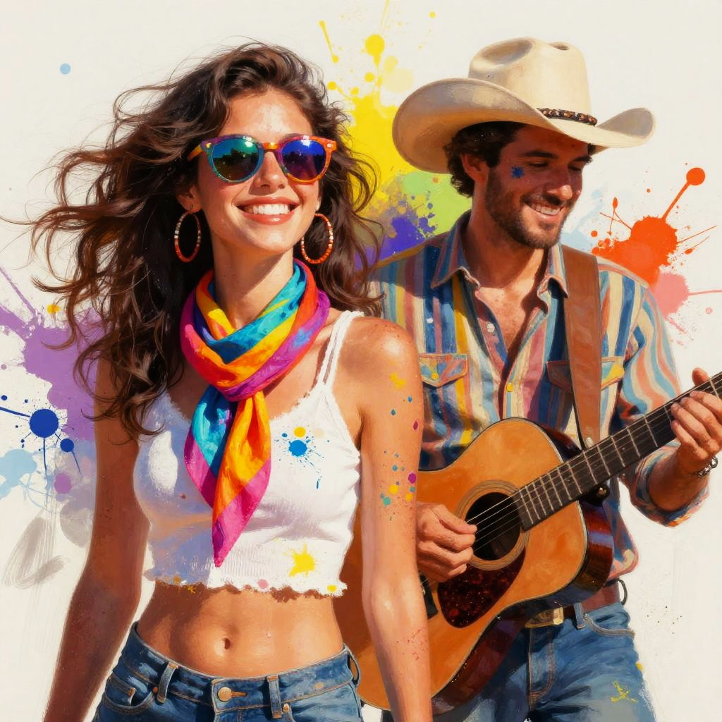 This vibrant digital painting features a smiling woman with colorful, reflective sunglasses and a bright, multicolored scarf, standing beside a man in a striped shirt and cowboy hat playing a guitar. Both are splattered with vivid paint, creating a dynamic, energetic scene. The background is abstract with splashes of color, enhancing the lively, festive atmosphere.