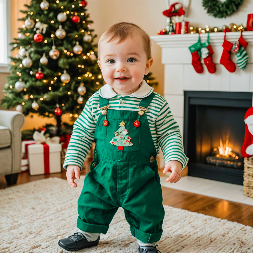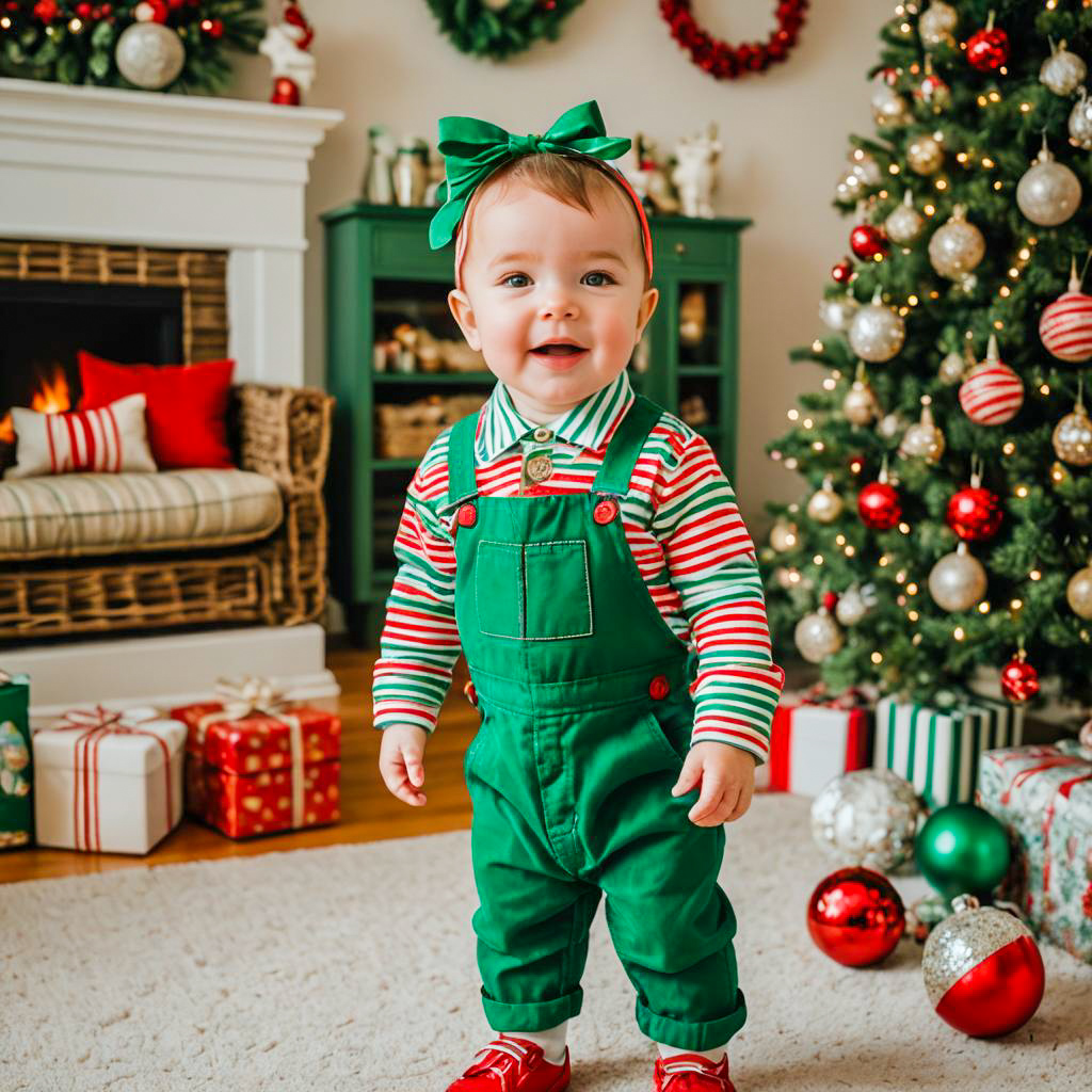 Baby girl Christmas outfit, worn by curious baby boy, featuring striped holiday shirt and festive overalls, in green and grey, set against cheerful living room decorated with ornaments.