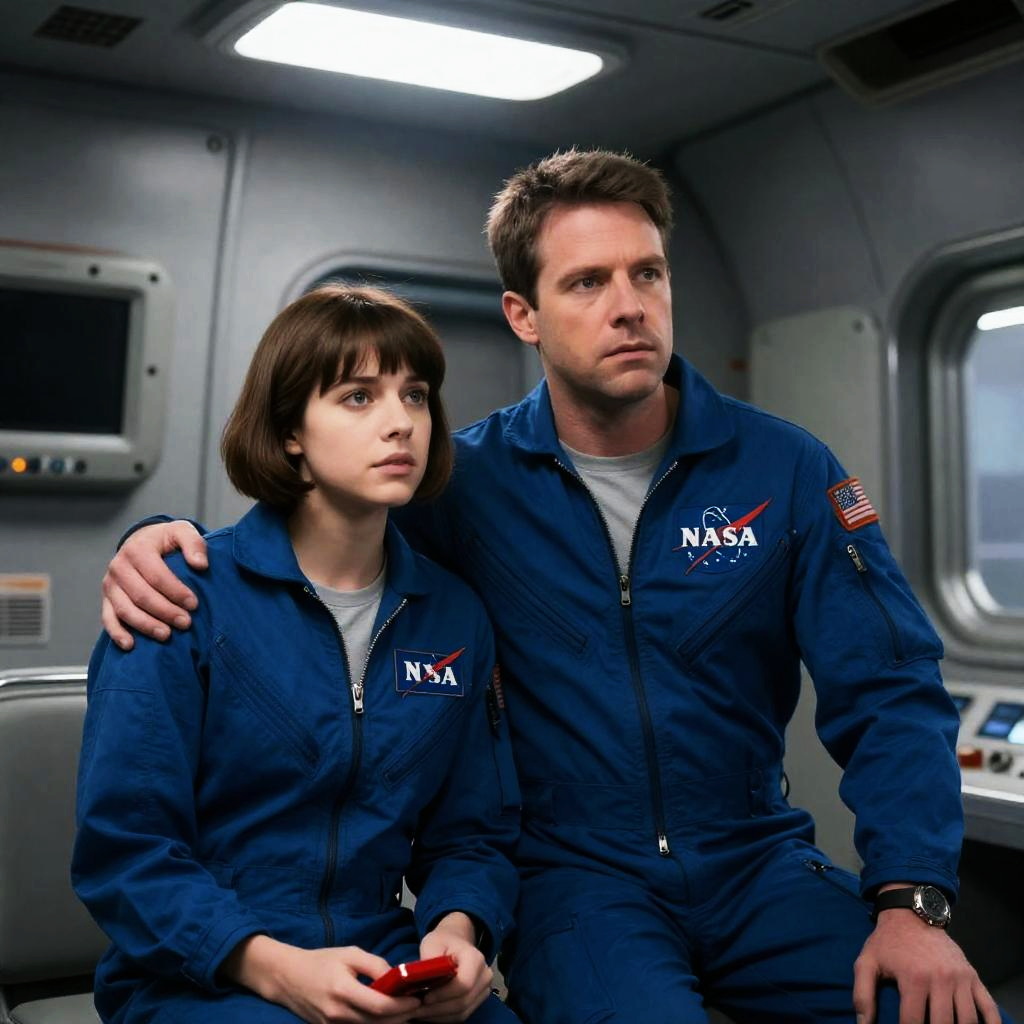 Photograph of a man and a woman in a dimly lit room. The man has dark hair, light skin, and wears a gray and white flight suit with a serious expression. The blonde woman with light skin also wears a similar flight suit, looking worried. Background includes yellow blinds and a red light. The man stands on the left, the woman on the right.