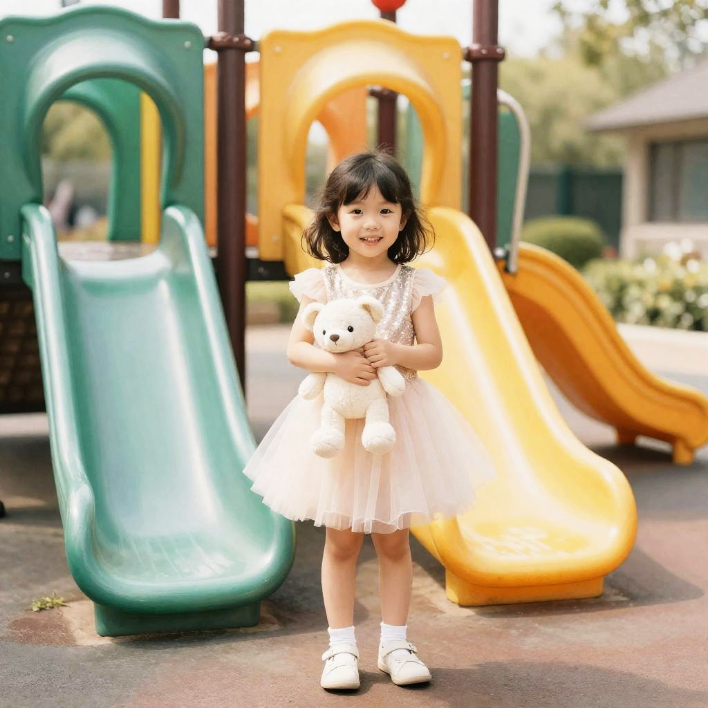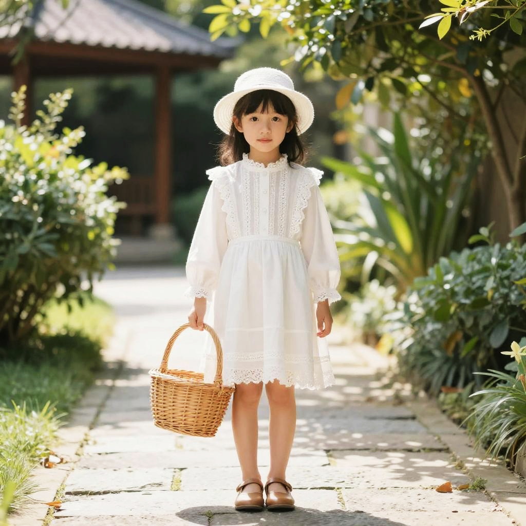 Photograph of a young girl standing in a sunlit, leafy garden pathway. She wears a white, long-sleeved, lace-trimmed dress with a high collar and a matching white hat. She holds a wicker basket in her right hand and stands on a stone pathway. Her dark hair peeks out from under the hat, and she wears light brown shoes. The background shows a wooden roof and lush greenery.