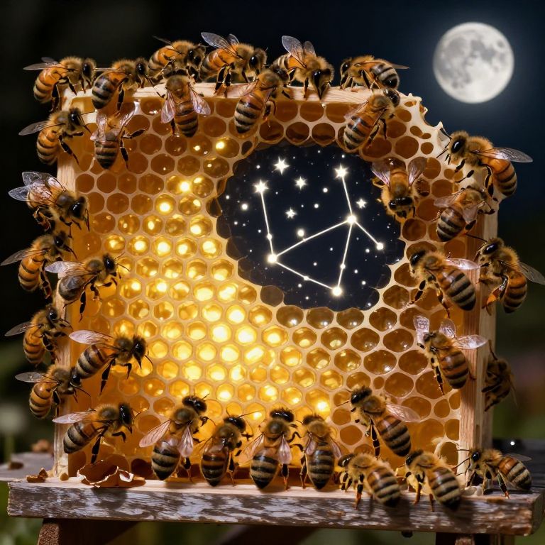 Photograph of a honeycomb frame adorned with numerous buzzing bees, illuminated by glowing honey, under a moonlit night sky with a star constellation.