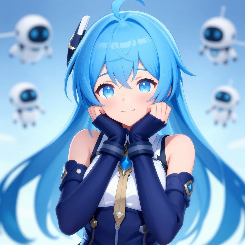 Digital anime-style illustration of a cute, blue-haired girl with large, vibrant blue eyes and long, flowing hair. She has a fair skin tone and is blushing slightly while resting her hands on her cheeks. She wears a black and white sleeveless top with a gold tie, black gloves, and a black headpiece. The background is a gradient of blue to white with four blurred, white, robot-like figures with black eyes floating around her. Her expression is shy and endearing, and the overall style is bright and colorful with a soft, glowing effect.