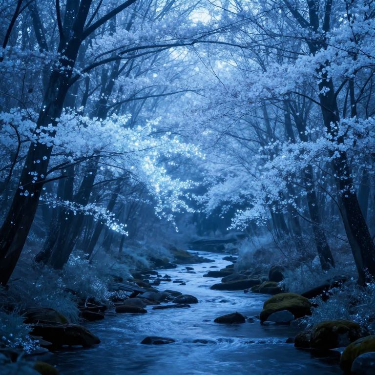 Photograph of a serene, blue-tinted forest stream with bare trees and glowing white blossoms, rocks along the water's edge, and a