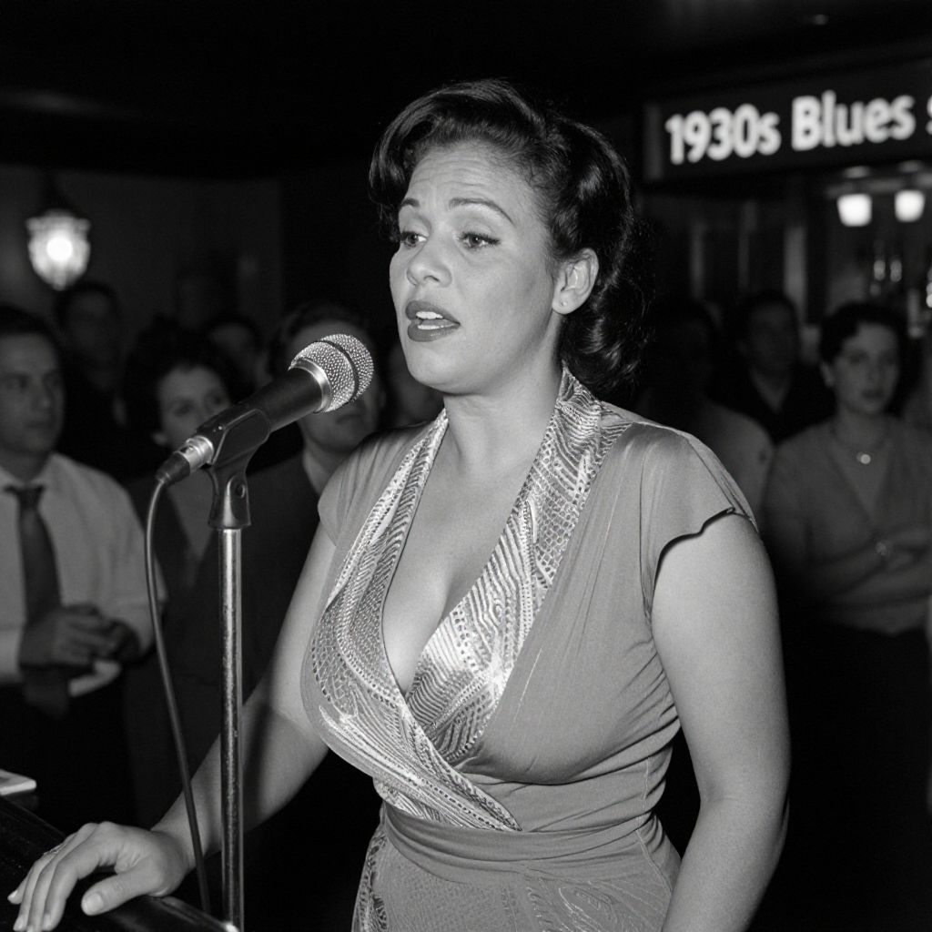 A black-and-white photograph of a woman in her early 30s, with a deeply lined face and a soulful, knowing expression, wearing a tailored flapper dress with a high collar, standing at a small microphone in a dimly lit bar in 1930s Mississippi, singing softly to the crowd, the mood is raw, emotional, and rich with deep blues tones, the setting feels authentic and grounded, the keyword '1930s blues singer' is clearly present in both subject and environment.. The woman has big tits and cute face