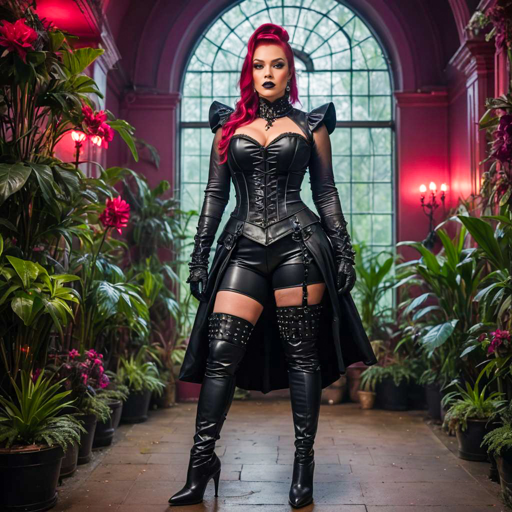 Photo of a Curvy woman, Straight and Sleek, dominatrix outfit, black leather corset with Tangerine accents, thigh-high boots made of Satin, fishnet stockings, high heels, studded choker, latex gloves, gothic cathedral, dramatic chiaroscuro
