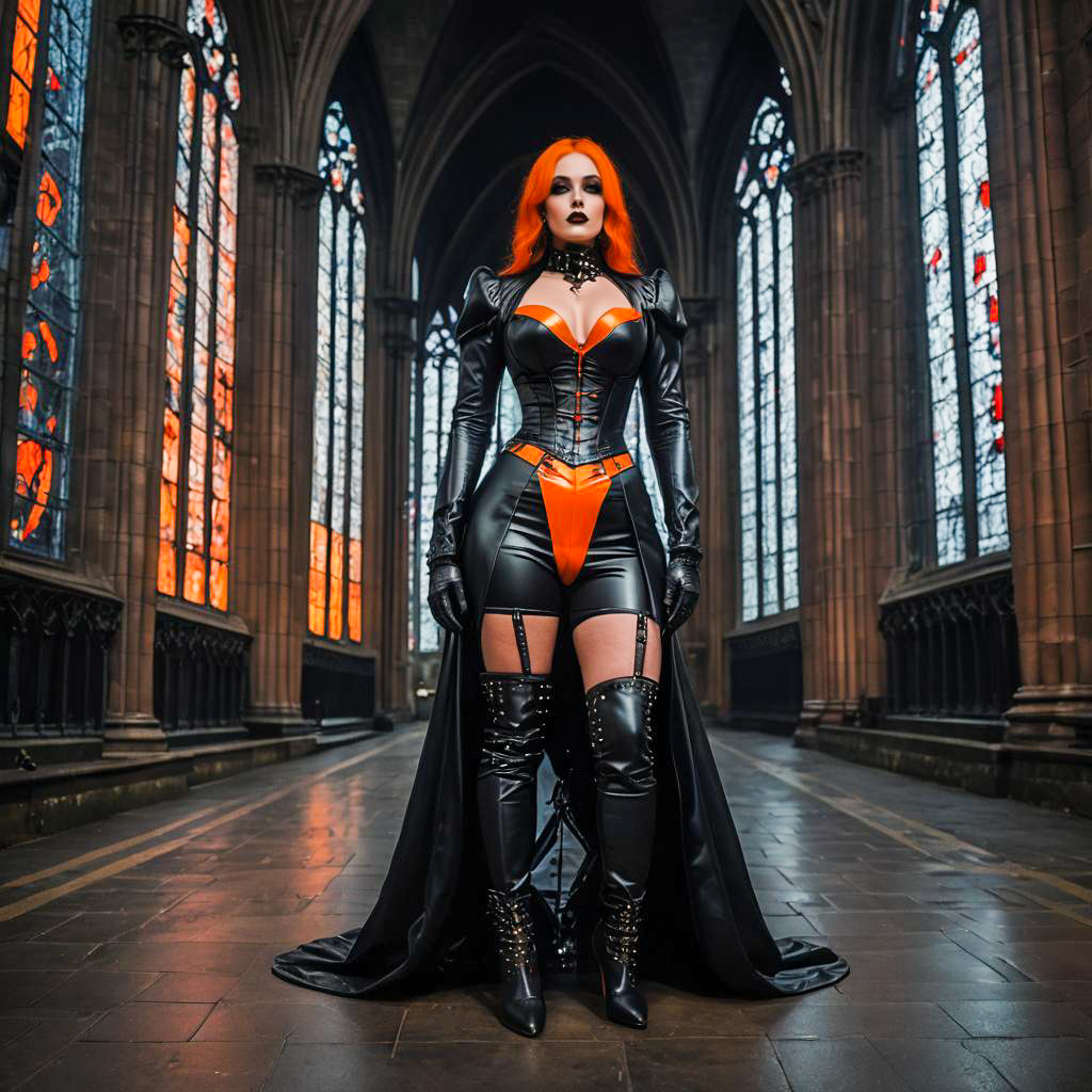 Curvy woman with vibrant orange hair wearing a black leather corset with tangerine accents, thigh-high satin boots, latex gloves, and a studded choker, standing inside a gothic cathedral featuring dramatic chiaroscuro lighting and stained glass windows.