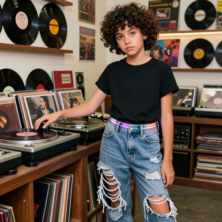 A bold fashion-forward teenager with a sharp square face, dark curly hair, and bright hazel eyes, wearing hip hop ripped jeans with asymmetrical tear design on the right leg and a glowing LED strip embedded along the crotch, standing in front of a vintage music store with vinyl records stacked high, one hand reaching toward a vintage turntable, the background showing a retro 90s music scene vibe.