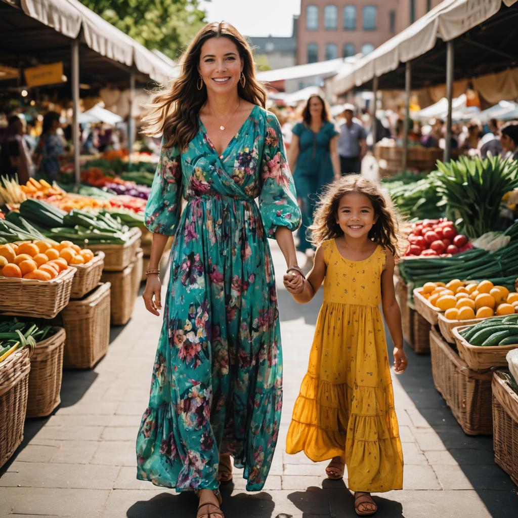 A confident young woman in a flowing maxi dress is shopping in a vibrant farmer's market, exchanging smiles with a child and exuding joy.